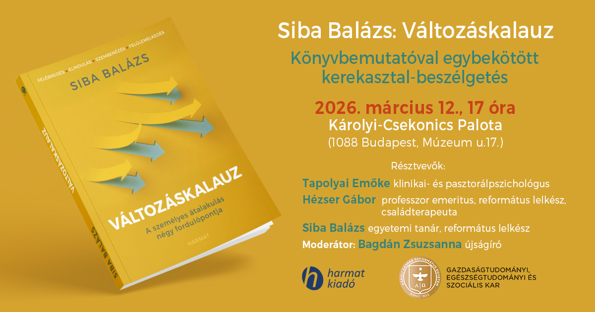 2026. március 12-én 17 órakor bemutatják be Siba Balázs református lelkész, a Gazdaságtudományi, Egészségtudományi és Szociális Kar egyetemi tanárának legújabb kötetét a Károlyi–Csekonics-palota Szivarszobájában.